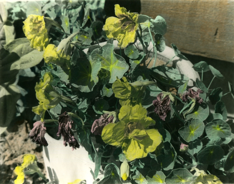 "August Flowers" My grandmother's house near Phelps Wisconsin. Black-and-white print hand colored.